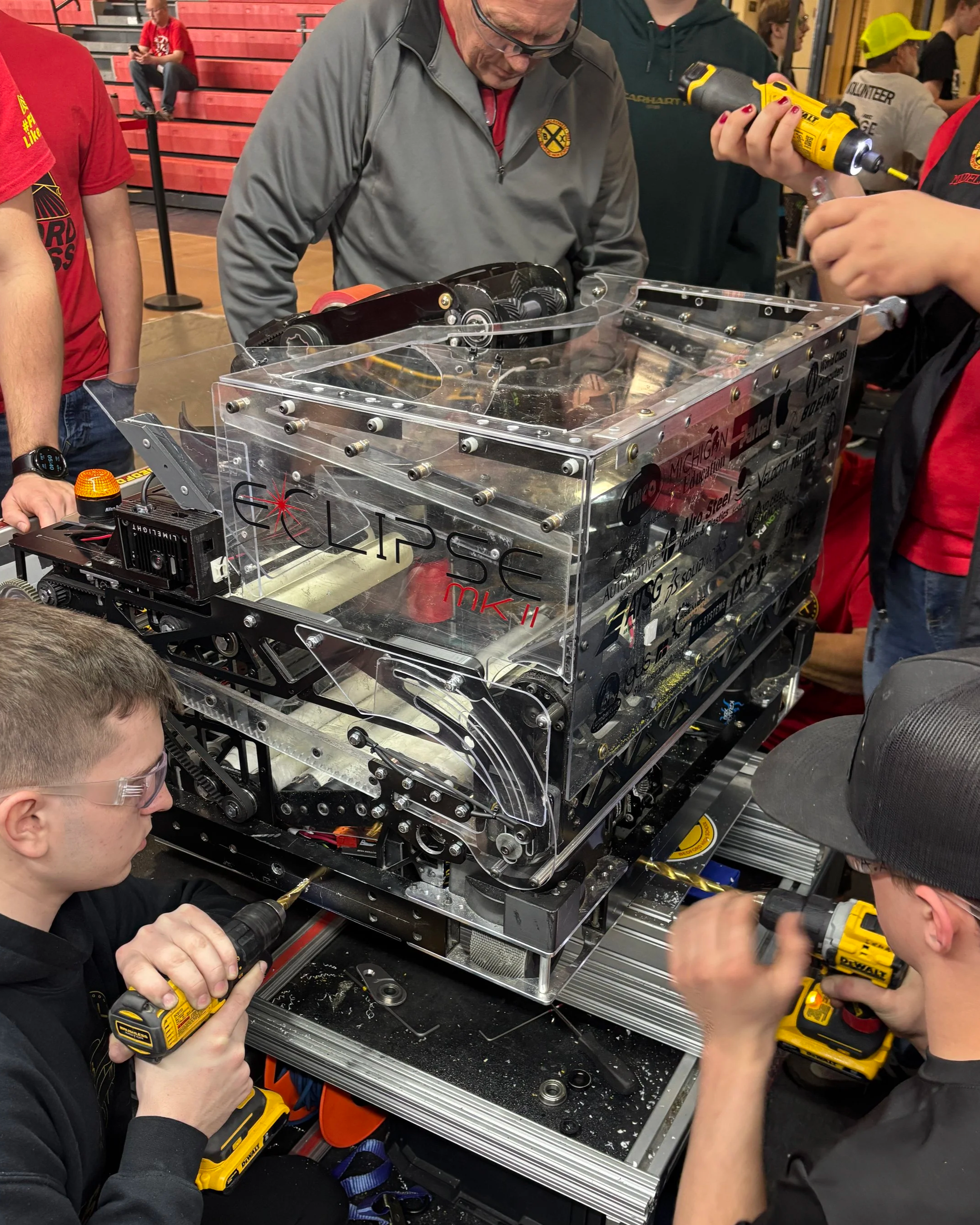 The first major obstacle our team faced occurred when we arrived at our competition on Thursday, April 9th. During the weigh-in for inspection, we discovered that our robot was 4.5 pounds overweight. Everyone quickly stepped up to the challenge, working together to reduce the weight. Through teamwork and determination, we successfully shaved off the excess pounds, made weight, and passed inspection.