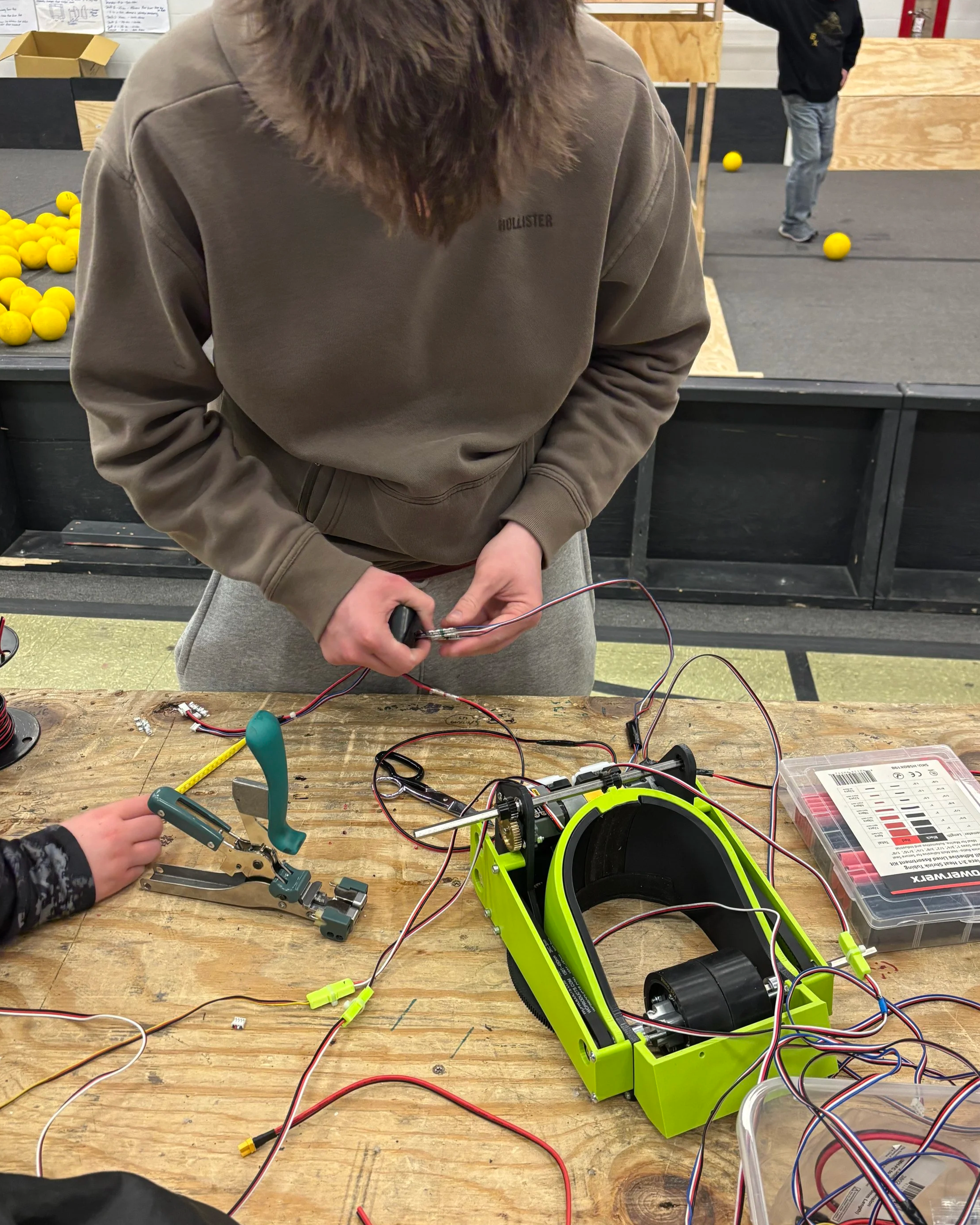 The night before unveil we added an over the bumper intake to our robot. We had to wire 2 X44 Krakens and the throughbore cancorder, which is a cancoder that is used as a position sensor. We also added a magnetic sensor so the turret knows where zero is.